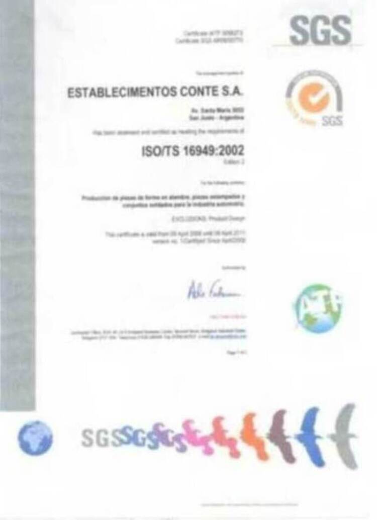 - 1. Establecimientos Conte. Certificada ISO 9001: 2008 e ISO TS 16949 por SGS. Sistema de Gestión Ambiental según norma ISO 14001.