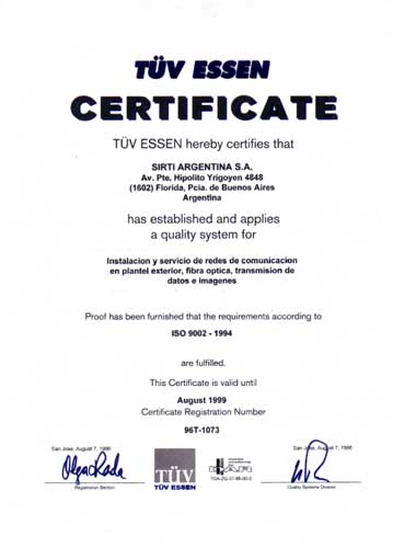 - 1. Sirti Argentina. Certificada ISO 9002 por TÜV ESSEN.