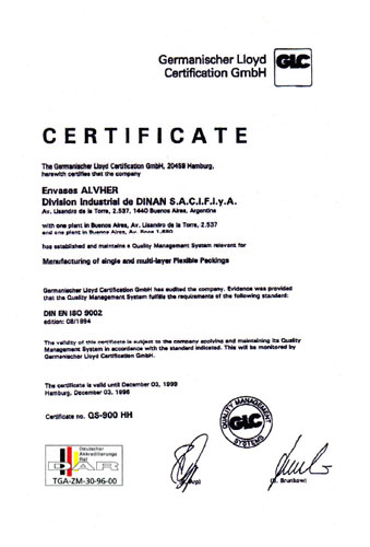 - 1. Envases Alvher. Certificada ISO 9002 por Germanischer Lloyd.