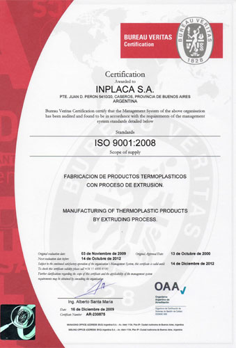 - 1. Inplaca. Certificada ISO 9001: 2015 por BVQI.