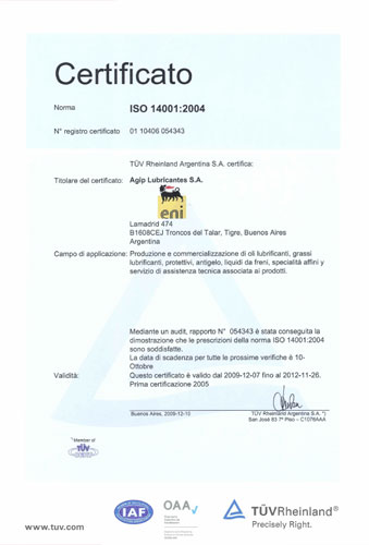 - 1. Agip Lubricantes. Certificada ISO 9001: 2008 e ISO 14001 por TÜV Rheinland.