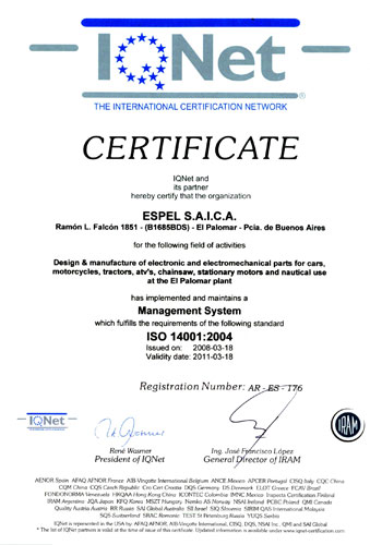 - 1. Espel (productos dze). Certificada ISO TS 16949 por UL e ISO 14001: 2004 por IRAM.