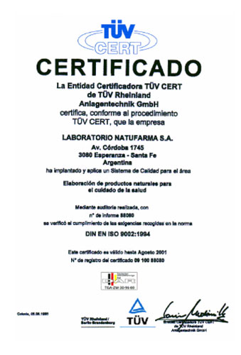- 1. Laboratorio Natufarma. Certificada ISO 9002 por TÜV Rheinland.