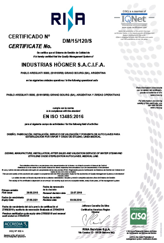 - 1. Industrias Högner. Certificada ISO 9001: 2015 e ISO 13485: 2016 por RINA.